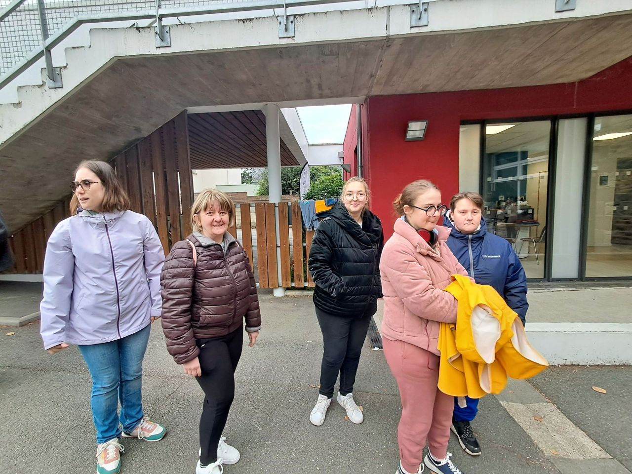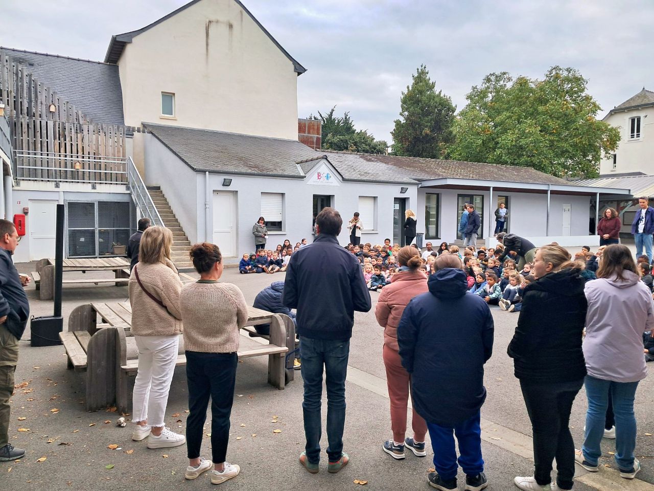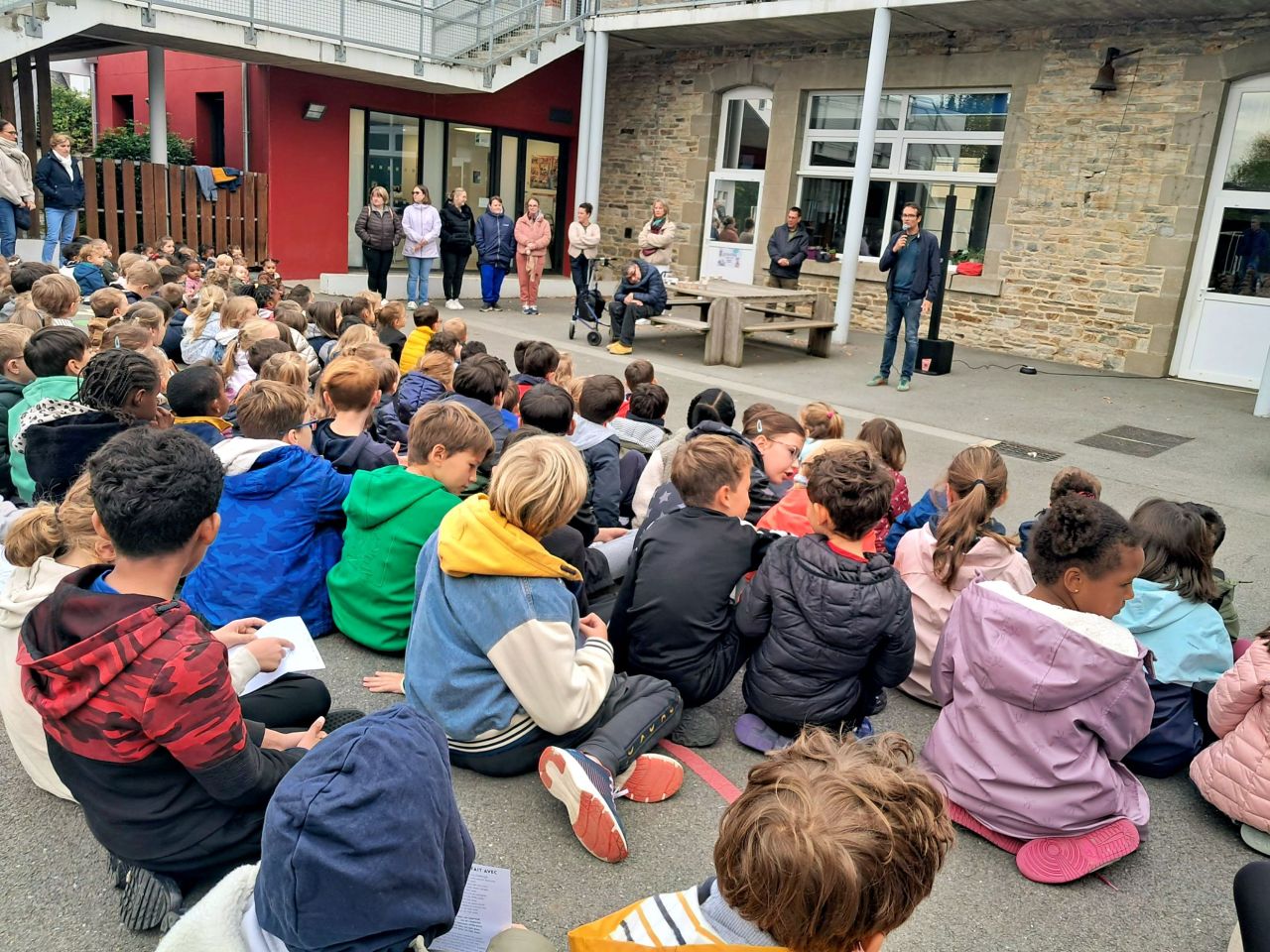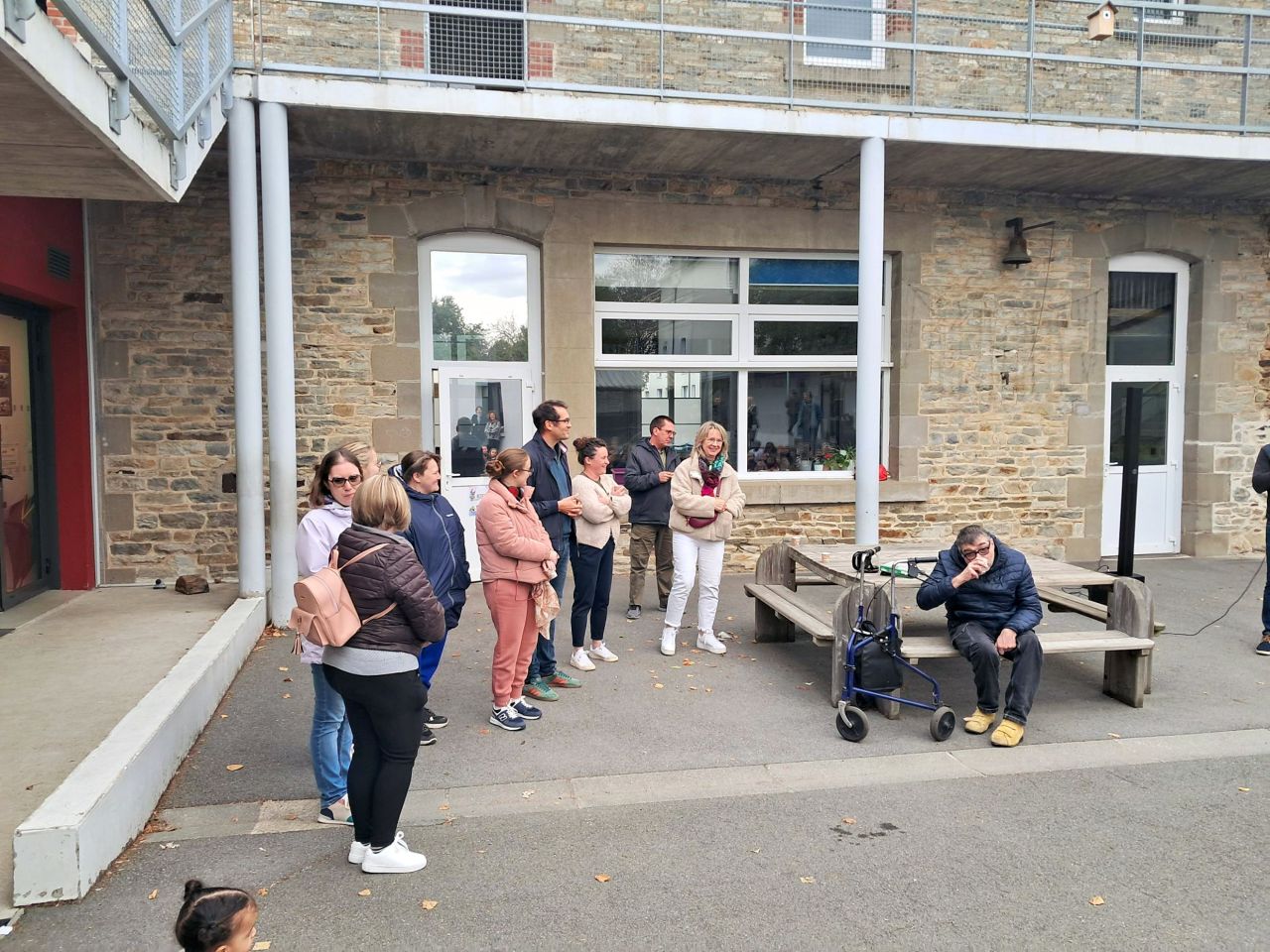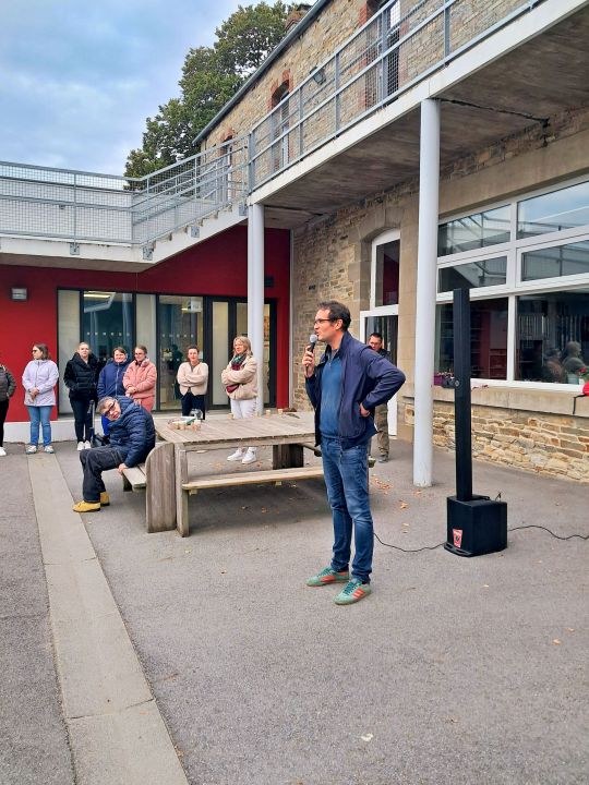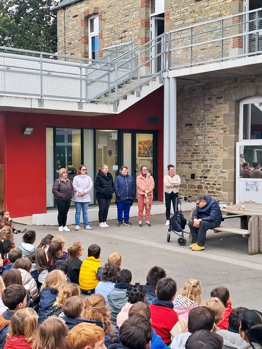 9h : regroupement sur la cour élémentaire pour accueillir les membres de l'ESAT de St Sauveur des Landes et présentation de cette structure qui permet aux personnes en situation de handicap d'exercer une activité professionnelle